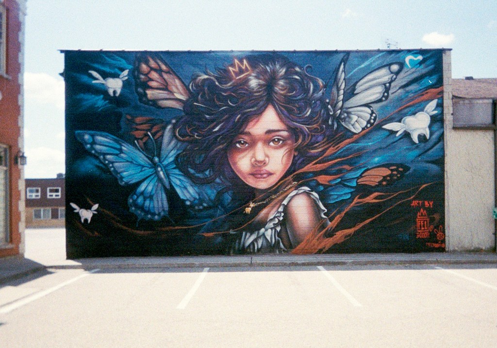 Chatham is known for its crow population, during October I was told the sky is flooded with migrating crows that come through the town each year. Its been dubbed crow city for this reason. Because of this quirk, there is both a Crow city barbers, and a Crow city cafe, along with other businesses incorporating crows into their branding. It also meant that crows were a reoccurring theme in a couple of the murals.